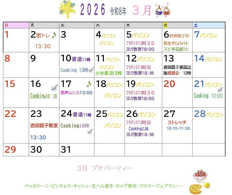 2026年3月の教室スケジュールです